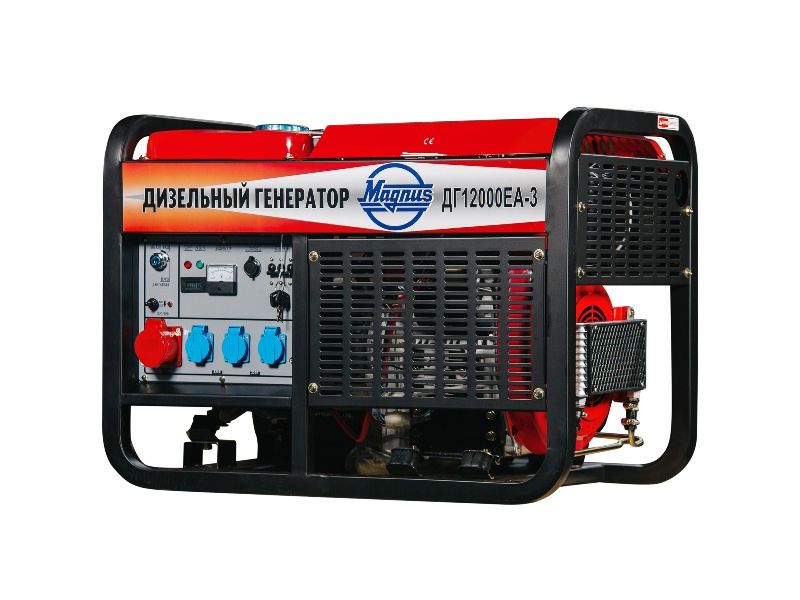 ✔Однофазный дизельный генератор Magnus ДГ15000ЕА, с максимальной мощностью до 11кВт и напряжением 220В. На фронтальной стороне присутствуют розетки с заземлением.