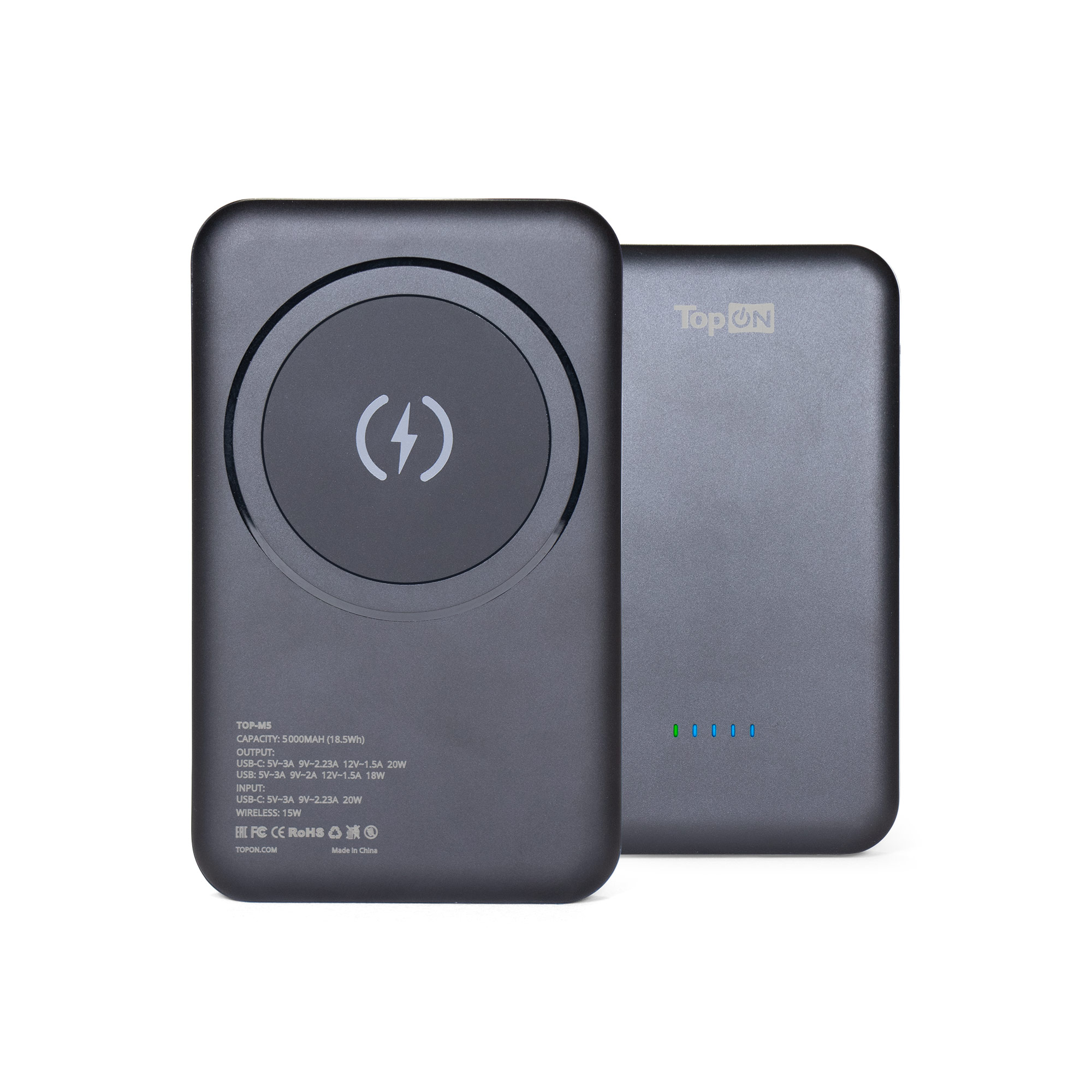 Внешняя аккумуляторная батарея TopON TOP-M5 имеет модуль беспроводной зарядки Qi на 15W на магнитном креплении MagSafe, с помощью которого можно заряжать смартфоны, планшеты, футляры наушников и другие гаджеты без провода. Магнитное крепление позволяет удобно и надежно зафиксировать внешнюю батарею на Apple iPhone 12, iPhone 12 Pro, iPhone 12 Pro Max, iPhone 13 mini, iPhone 13, iPhone 13 Pro, iPhone 13 Pro Max и Samsung Galaxy Z Fold 3, как беспроводная магнитная зарядка Apple MagSafe Charger (MHXH3ZE/A), или внешний аккумулятор MagSafe Battery Pack (MJWY3ZE/A), обеспечивая точное совмещение модуля беспроводной зарядки и встроенного приемника ресивера в смартфоне.